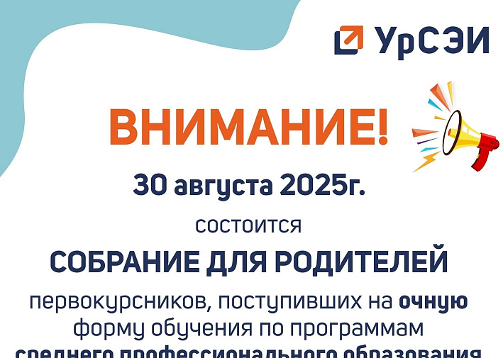 30 августа состоится СОБРАНИЕ ДЛЯ РОДИТЕЛЕЙ первокурсников, поступивших на ОЧНУЮ форму обучения по программам среднего профессионального образования.