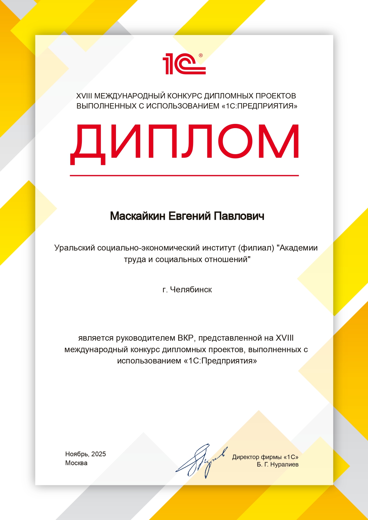 Выпускник Уральского социально-экономического института (филиала) Академии труда и социальных отношений Александр Григорьев вошел в число победителей XVIII Международного конкурса выпускных квалификационных работ (ВКР), выполненных с использованием программных продуктов «1С». Конкурс проводился фирмой «1С» по итогам 2024/2025 учебного года.